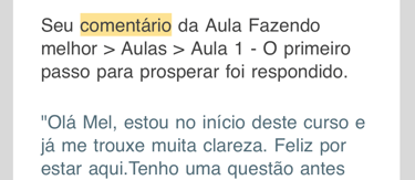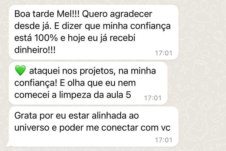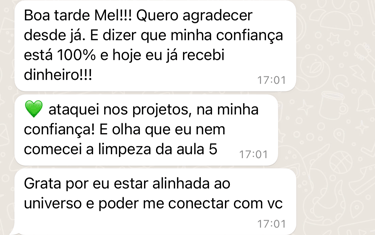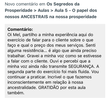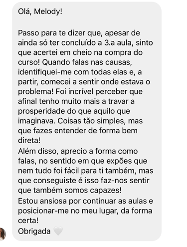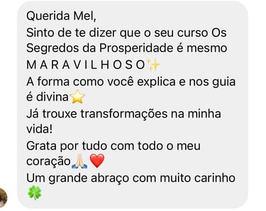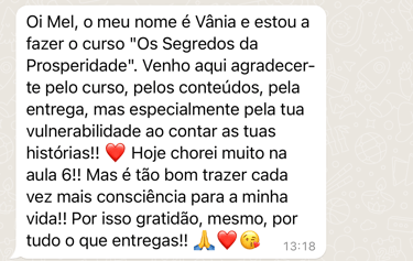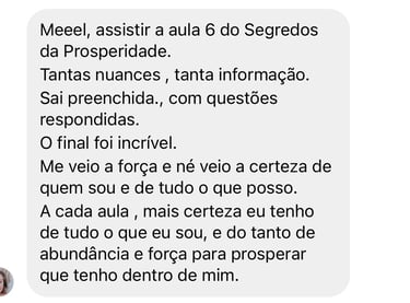 Esse é apenas um dos depoimentos de uma aluna 1 DIA depois de entrar no curso Os Segredos da Prosperidade...